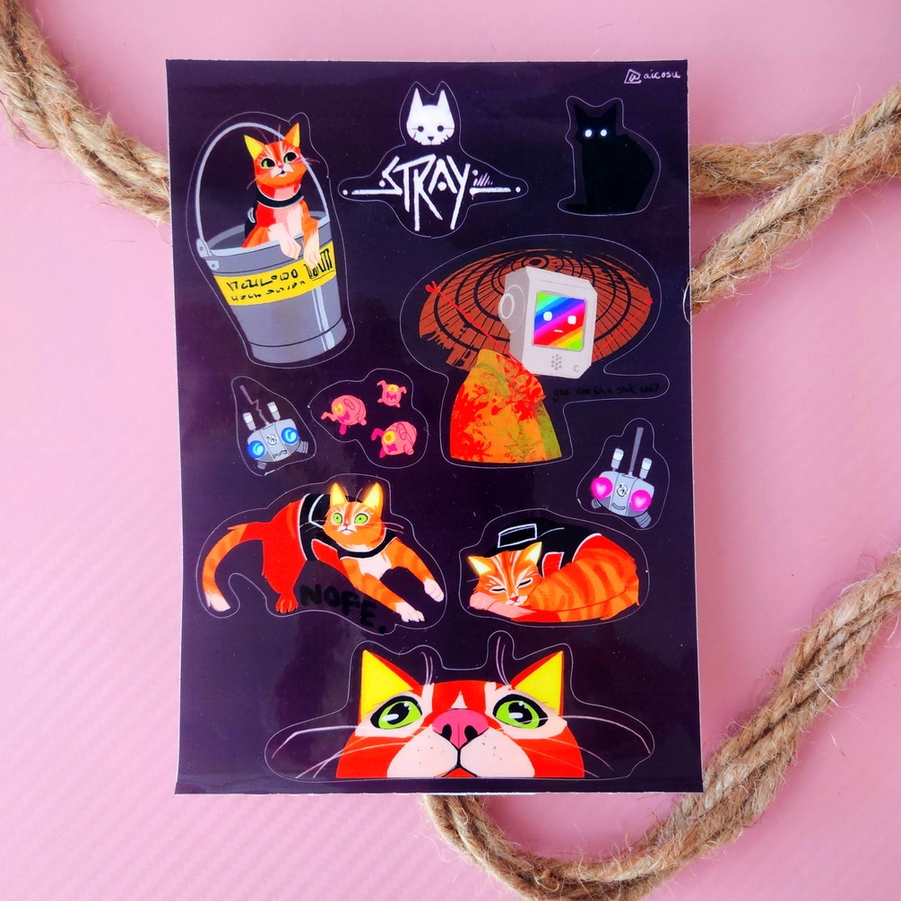 A 5 x 7 sticker sheet featuring some good cat faces, an accompanying b12, and Momo!